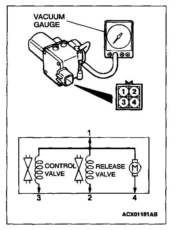 - Connect the positive battery terminal to auto-cruise vacuum pump connector terminal 1, and the negative battery terminal to terminals 2, 3, and 4.