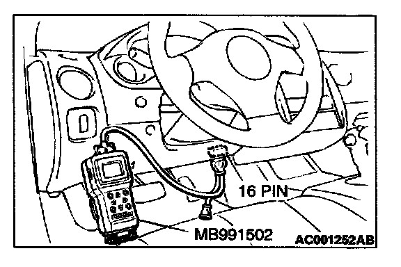 CAUTION: To prevent damage to scan tool MB991502, always turn the ignition switch to "LOCK" (OFF) position before connecting or disconnecting scan tool MB991502.