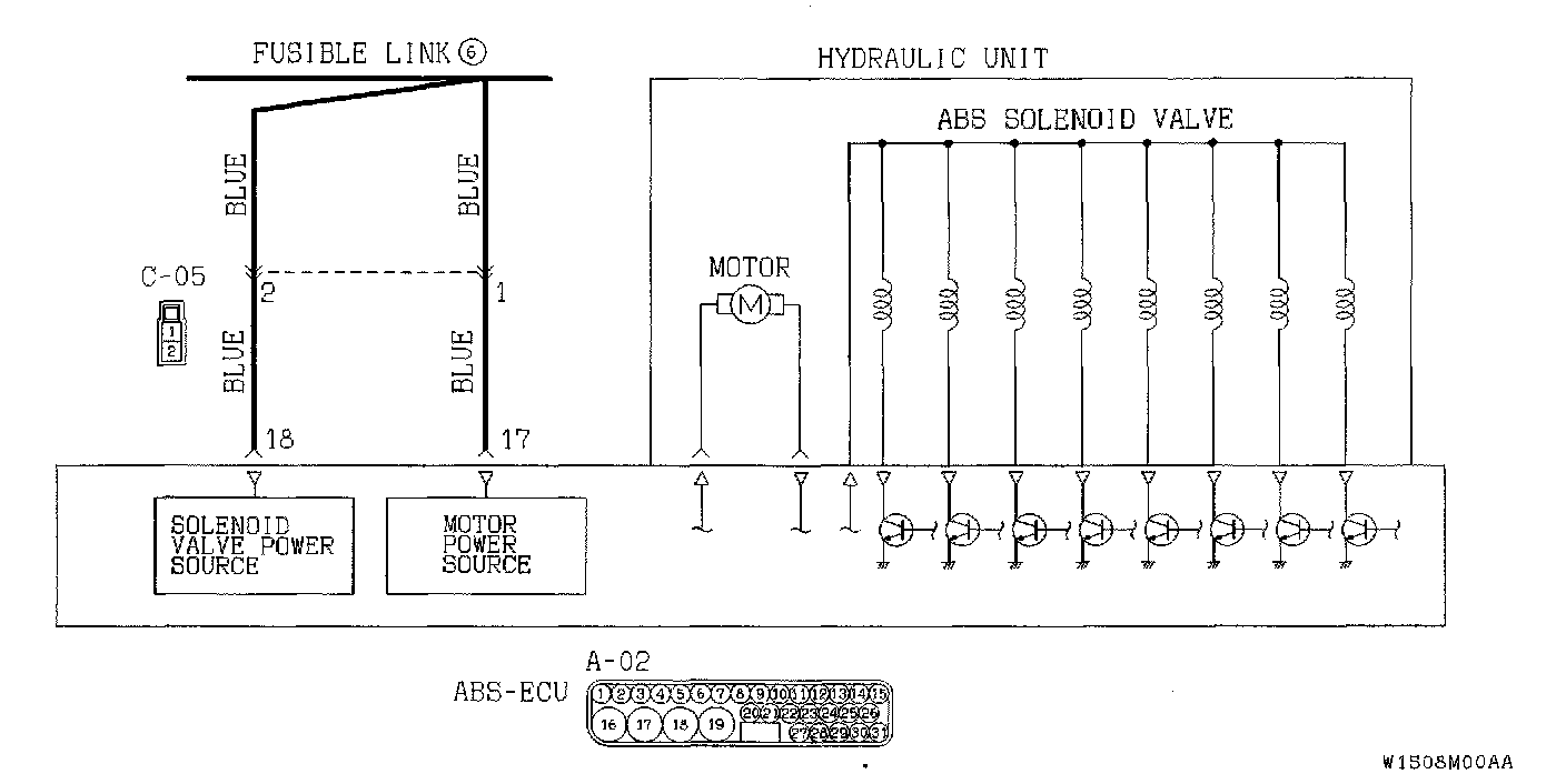 Power is continuously supplied to the ABS-ECU through fusible link number 6 to operate the solenoid valve and motor.