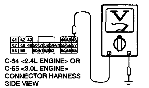 STEP 8: Check the power supply voltage at PCM connector C-54 <2.4L Engine> or C-55 <3.0L Engine> by backprobing.