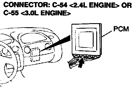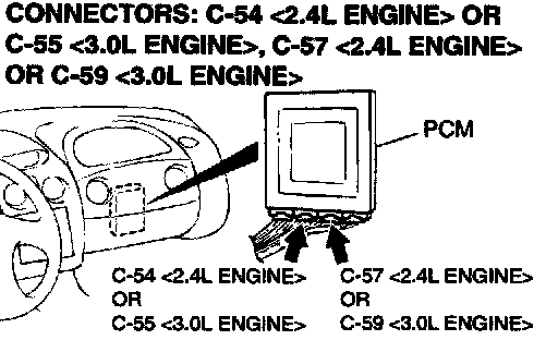 STEP 14: Check connectors C-54 <2.4L Engine> or C-55 <3.0L Engine> and C-57 <2.4L Engine> or C-59 <3.0L Engine> at PCM for damage.