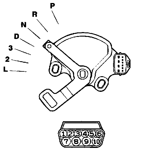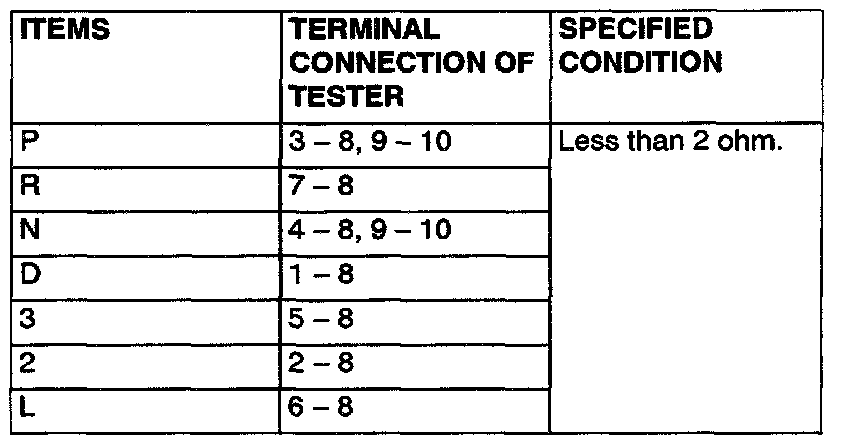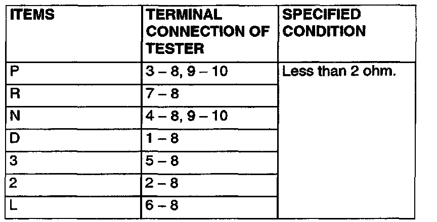 Check for continuity between terminals for each selector position. "ON" For vehicles with sport mode, four positions (P, R, N, D) are used.