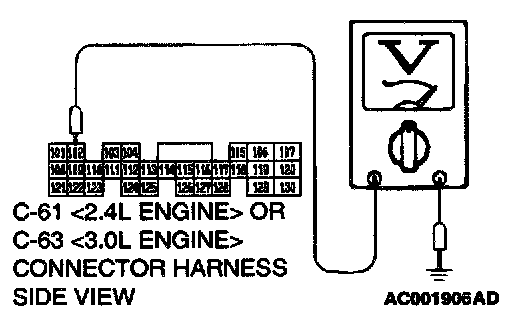 STEP 22: Check the switch output voltage at PCM connector C-61 <2.4L Engine> or C-63 <3.0L Engine> by backprobing.
