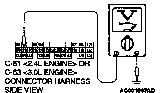 STEP 39. Check the switch output voltage at PCM connector C-61 <2.4L Engine> or C-63 <3.0L Engine> by backprobing.