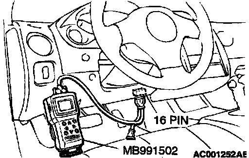 CAUTION: To prevent damage to scan tool MB991502, always turn the ignition switch to "LOCK" (OFF) position before connecting or disconnecting scan tool MB991502.