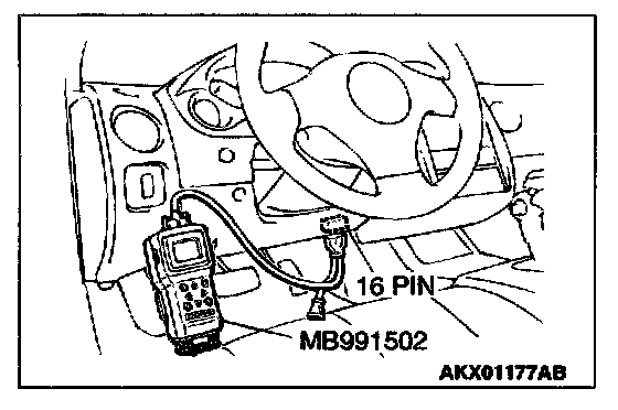 CAUTION: To prevent damage to scan tool MB991502, always turn the ignition switch to the "LOCK" (OFF) position before connecting or disconnecting scan tool MB991502.