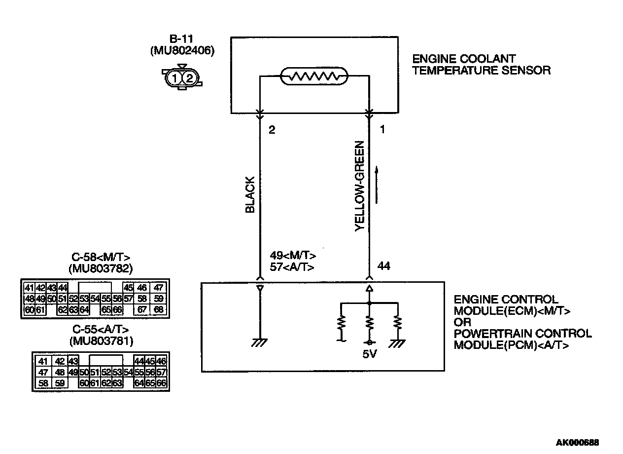 - 5-volt voltage is applied to the engine coolant temperature sensor output terminal (terminal 1) from the ECM (terminal 44) or PCM (terminal 44) via the resistor in the ECM or PCM . The ground terminal (terminal 2) is grounded with ECM (terminal 49) or PCM (terminal 57) . The engine coolant temperature sensor is a negative temperature coefficient type of resistor. It has the characteristic that when the engine coolant temperature rises the resistor decreases.