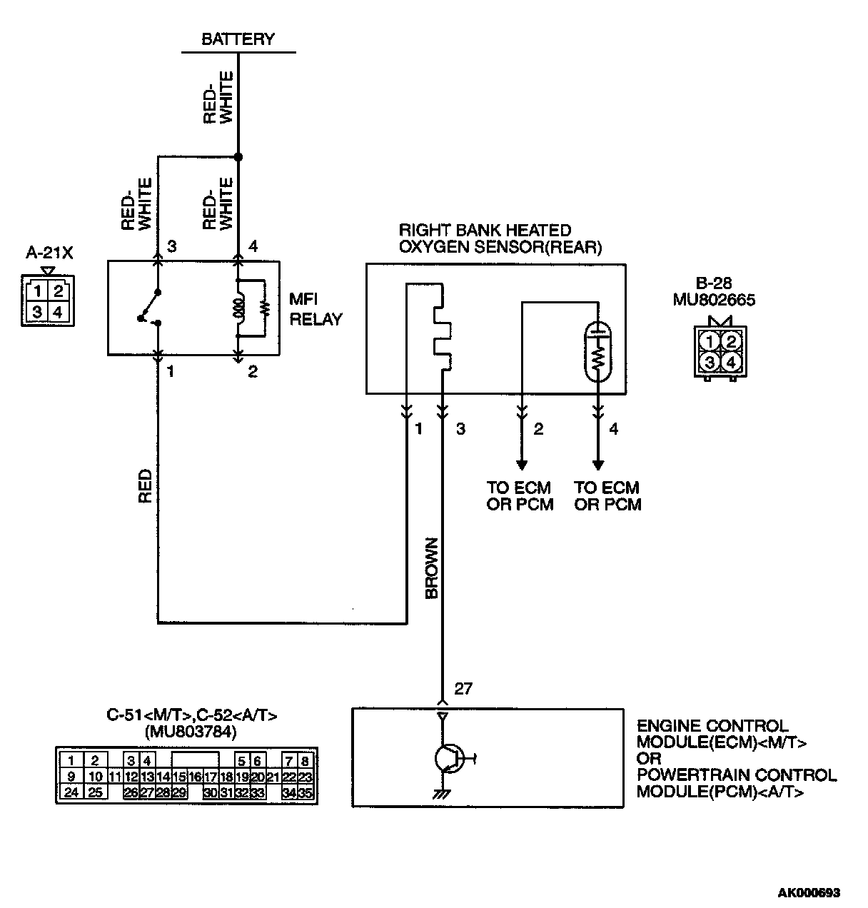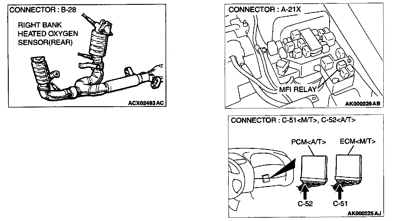 STEP 9. Check for harness damage between MFI relay connector A-21X terminal 1 and right bank heated oxygen sensor (rear) connector B-28 terminal 1.