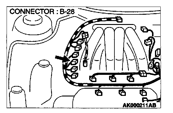 1. Disconnect right bank heated oxygen sensor (rear) connector B-28 and connect test harness special tool, MB991316, to the connector on the right bank heated oxygen (rear) sensor side.