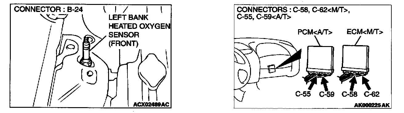 STEP 6. Check connector B-24 at left bank heated oxygen sensor (front) and connector C-62 at ECM
