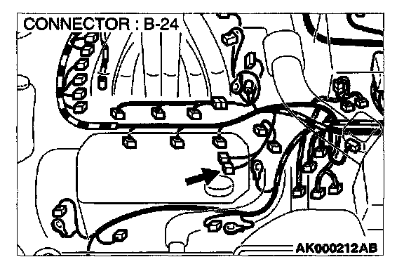 1. Disconnect the left bank heated oxygen sensor (front) connector B-24 and connect test harness special tool, MD998464, to the connector on the left bank heated oxygen sensor (front) side.