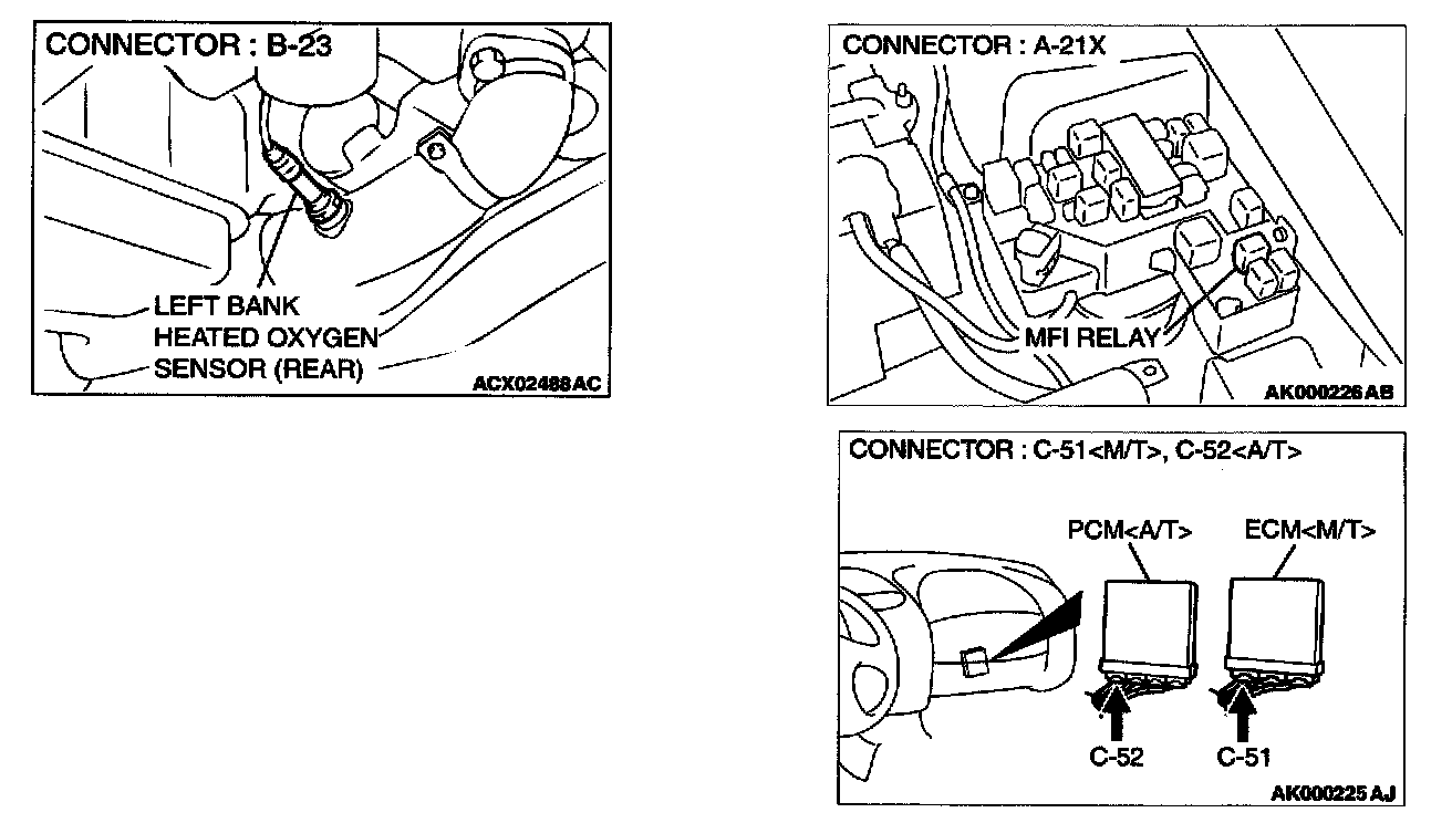 STEP 9. Check for harness damage between MFI relay connector A-21X terminal 1 and left bank heated oxygen sensor (rear) connector B-23 terminal 1.