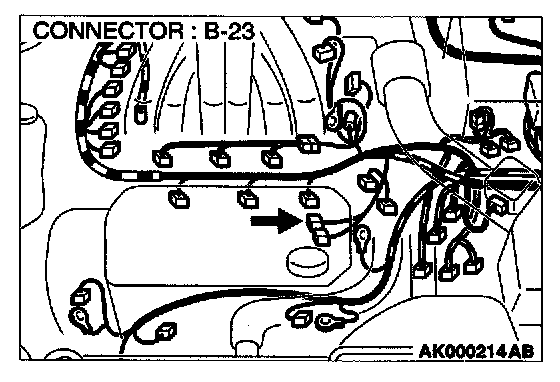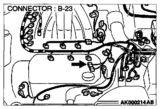 1. Disconnect left bank heated oxygen sensor (rear) connector B-23 and connect test harness special tool, MB991316, to the connector on the left bank heated oxygen (rear) sensor side.