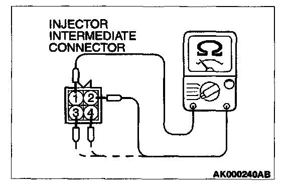 2. Measure the resistance between injector side connector terminal 1 and 2.