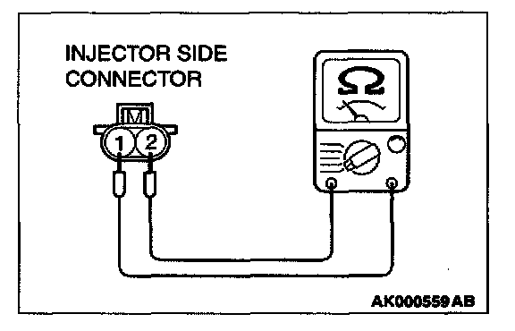 2. Measure the resistance between each injector side connector terminal 1 and 2.