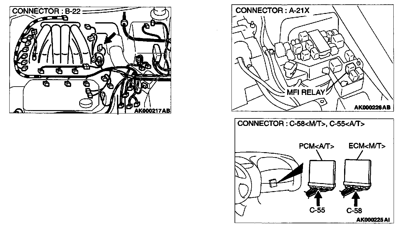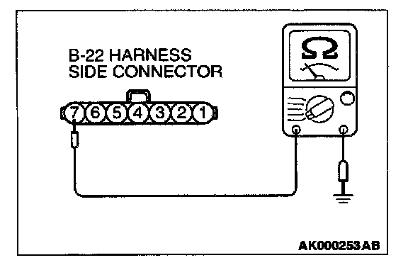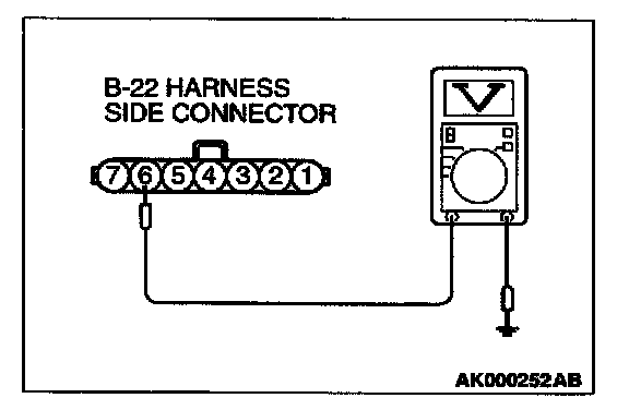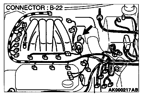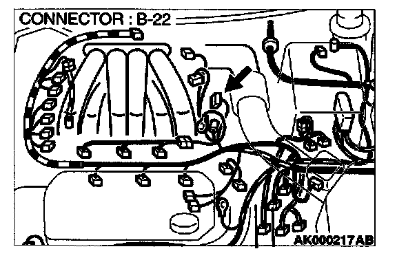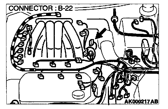 1. Disconnect the camshaft position sensor connector B-22, and connect test harness special tool (MB991348) in between. (All terminals should be connected.)