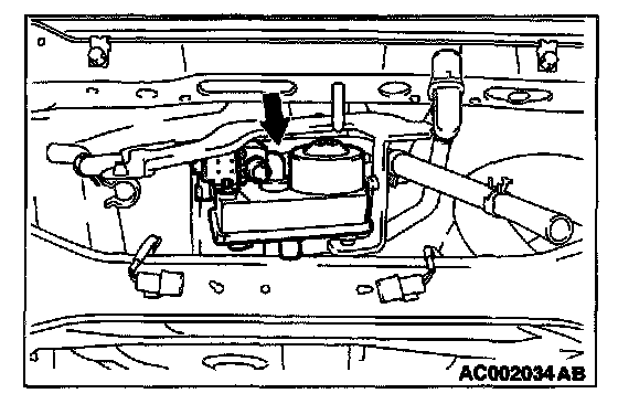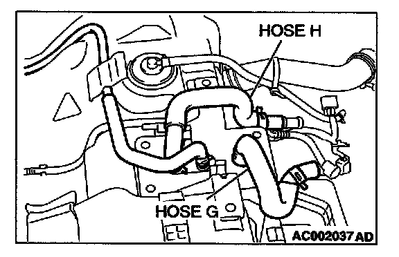 1. Remove the module bracket mounting bolts, and disconnect hose G from the evaporative emission ventilation solenoid side, and plug the hoses from which the hoses have been disconnected.