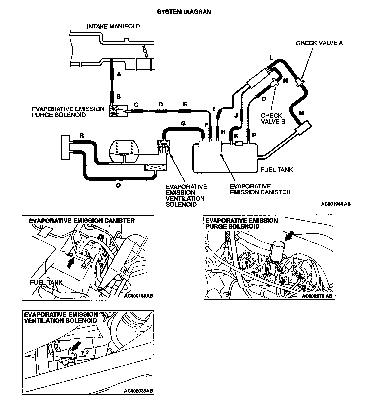 1. Use scan tool MB991502 to activate the evaporative emission purge solenoid valve.