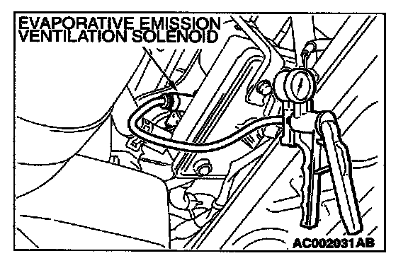 4. Drive the evaporative emission ventilation solenoid with the scan tool MB991502 actuator test, and confirm that the vacuum does not fluctuate when the vacuum is applied with the hand vacuum pump.