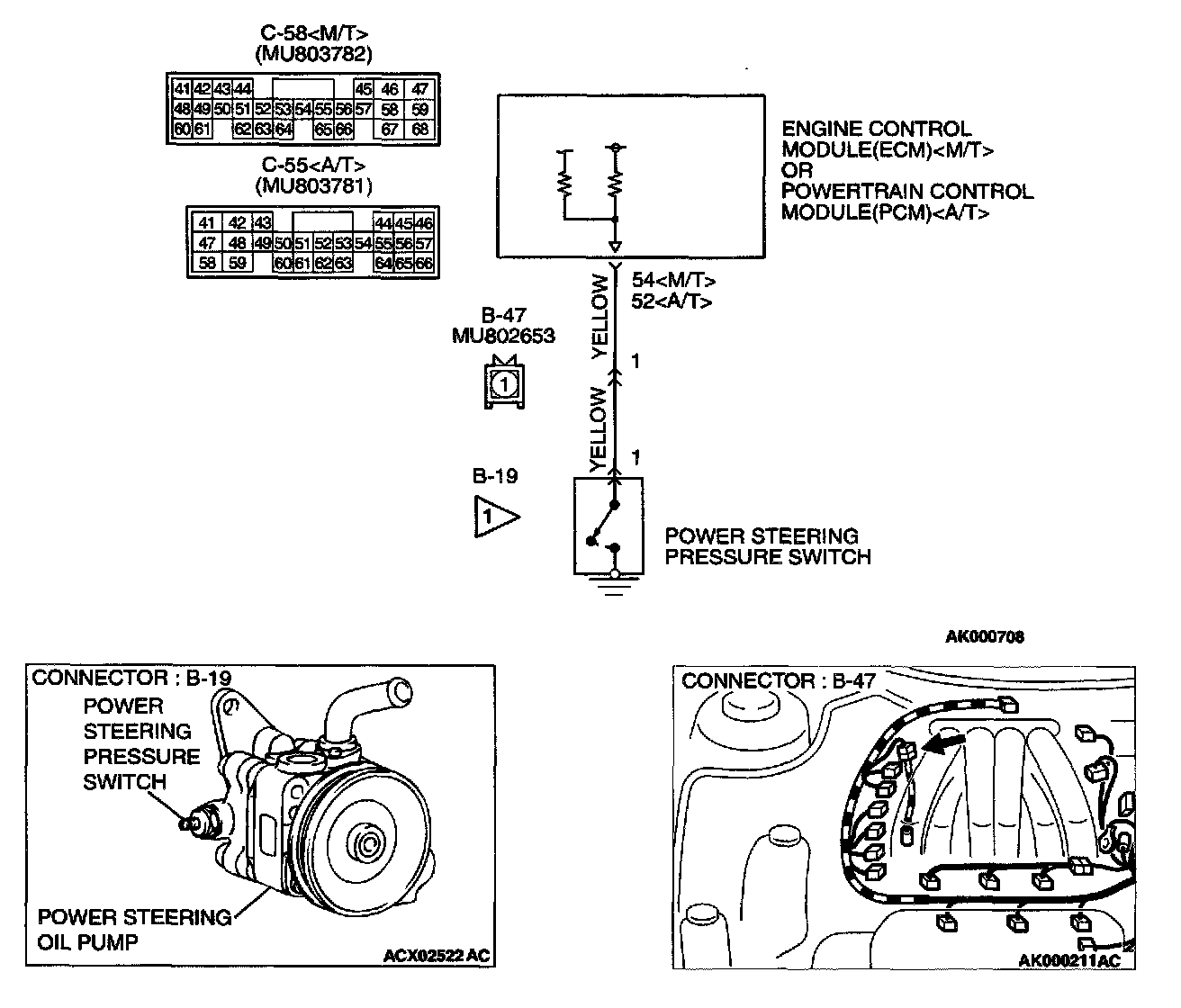 YES: Check connector B-47 at intermediate connector for damage, and repair or replace as required. Refer to Harness Connector Inspection. If intermediate connector is in good condition, repair harness wire between power steering pressure switch connector B-19 terminal 1 and ECM connector C-58 terminal 54