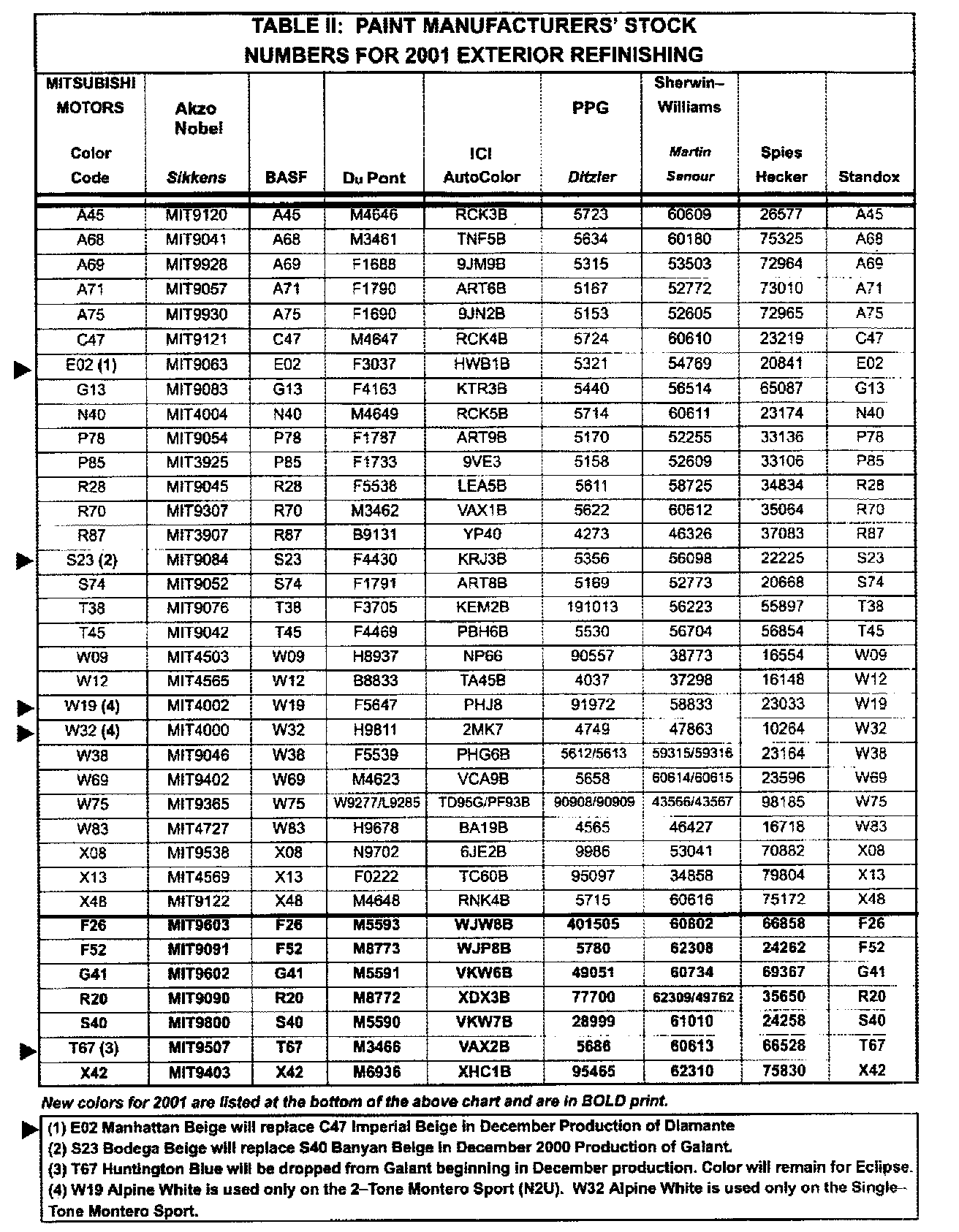 Table II contains the manufacturers' stock numbers from several automotive refinish companies, which correspond with the Color Codes and Model Applications shown in Table I. The new colors for 2001 are identified by bold characters.
