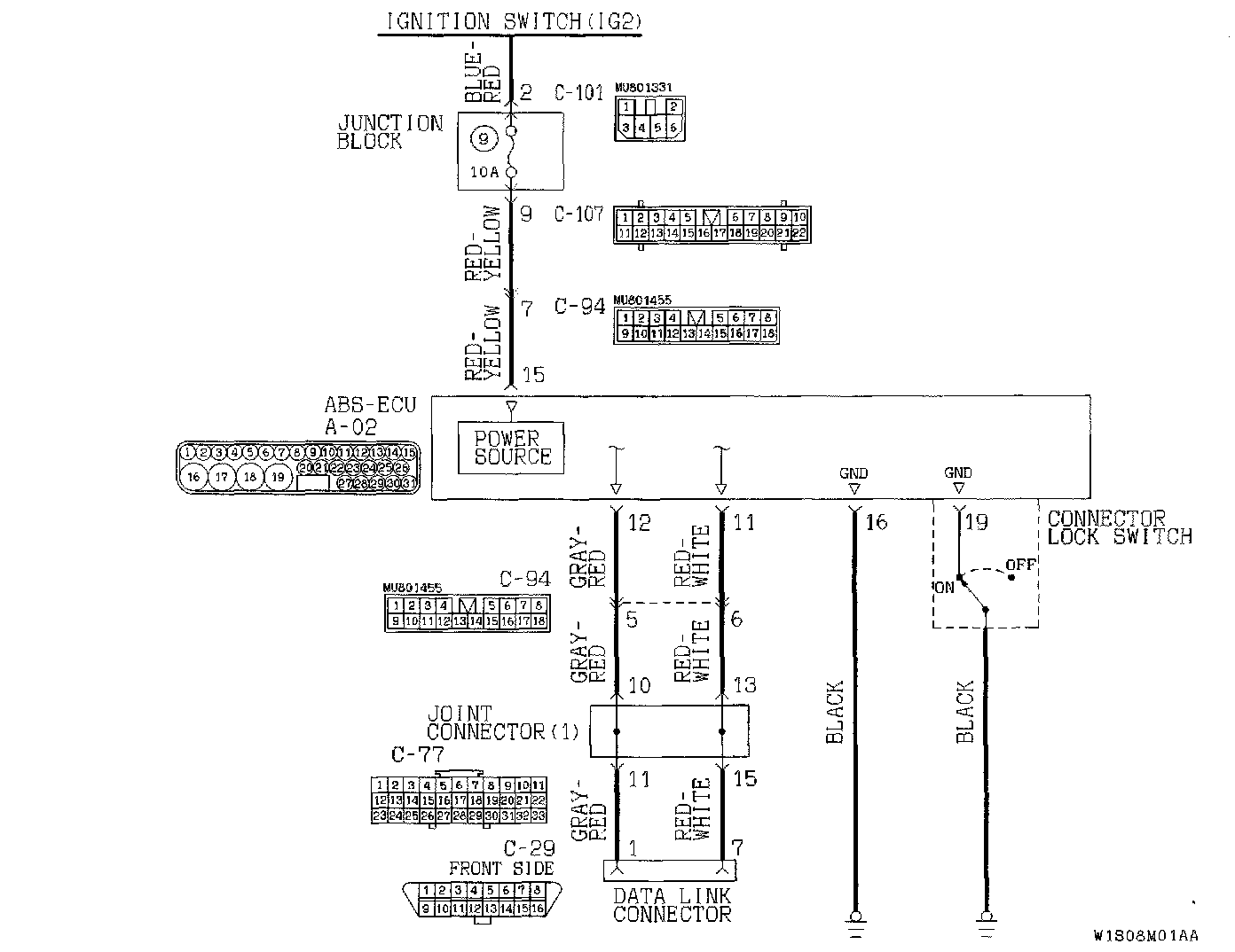 - The diagnostic output is made from the ABS-ECU (terminal 11) to the diagnostic output terminal (terminal 7) of the data link connector.