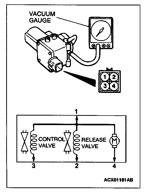 1. Connect the positive battery terminal to auto-cruise vacuum pump connector terminal 1, and the negative battery terminal to terminals 2, 3, and 4.
