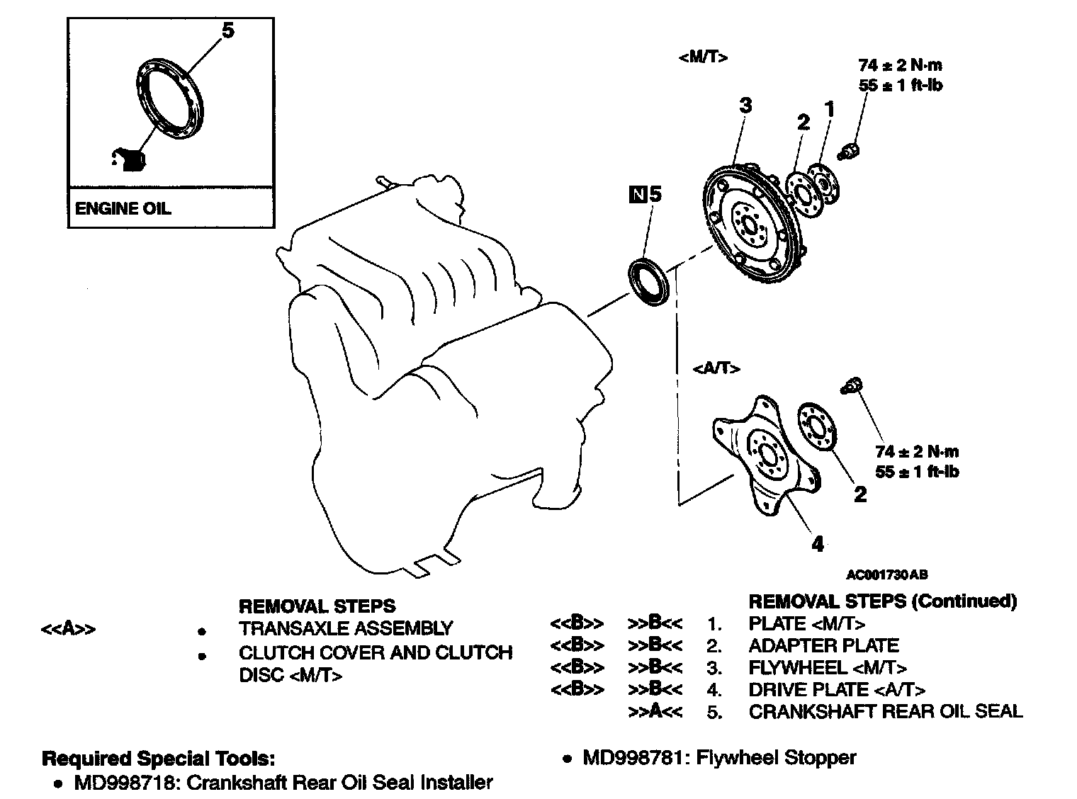 Use special tool MB998781 to secure the flywheel or drive plate, and remove the bolts.