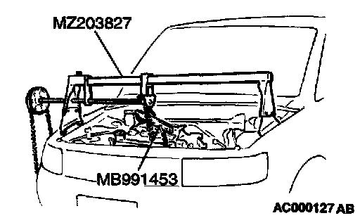 3. Remove the chain block and support the engine assembly with special tools MB991453 and MZ203827.