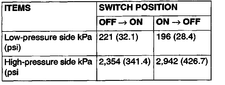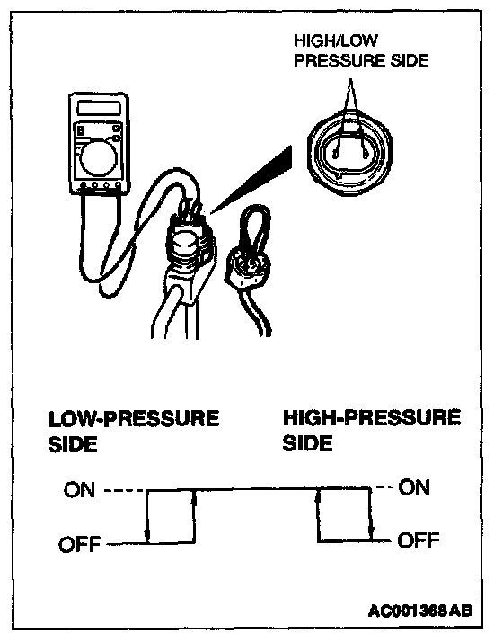 3. When the high/low pressure sides of the dual pressure switch are at operation pressure (ON) and there is continuity between the respective terminals.