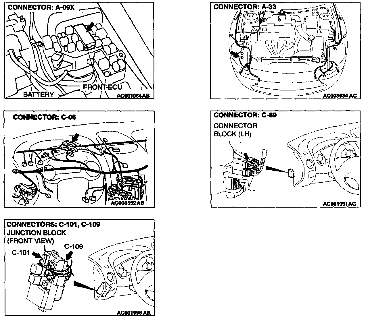STEP 8. Check washer motor connector A-33 and front-ECU connector A-09X for damage.
