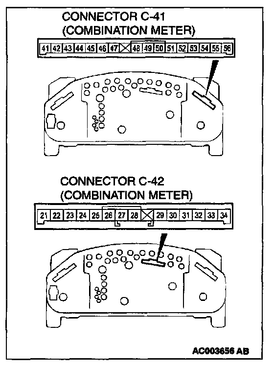 3. Install the bulb to the combination meter, and then measure the resistance between connector C-41 terminal 52 and connector C-42 terminal 26. The resistance reading at this time should be much the same as the resistance measured at Step (2).