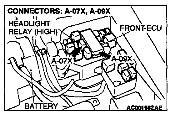 STEP 8. Check headlight relay (high) connector A-07X and front-ECU connector A-09X for damage.