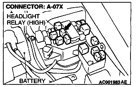 1. Disconnect the headlight relay (high) connector A-07X and measure at the relay box side.