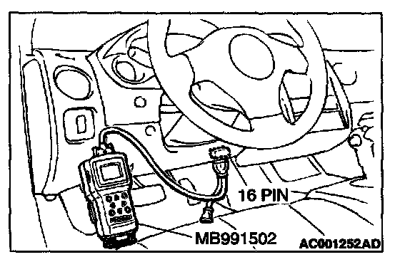 CAUTION: To prevent damage to scan tool MB991502, always turn the ignition switch to the "LOCK" (OFF) position before connecting or disconnecting scan tool MB991502.