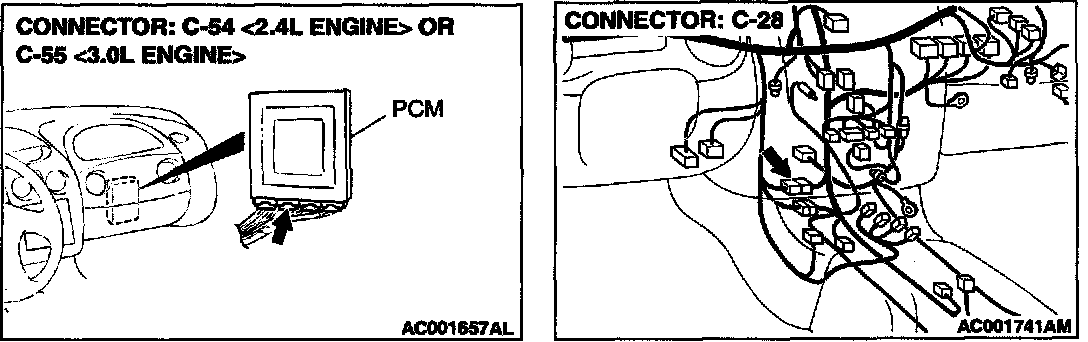 STEP 3. Check connector C-54 <2.4L Engine> or C-55 <3.0L Engine> at PCM for damage.