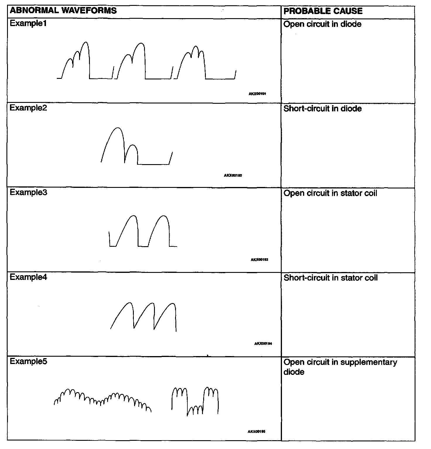NOTE: Identification of abnormal waveforms is easier when there is a large output current (regulator is not operating). (Waveforms can be observed when the headlights are illuminated.)