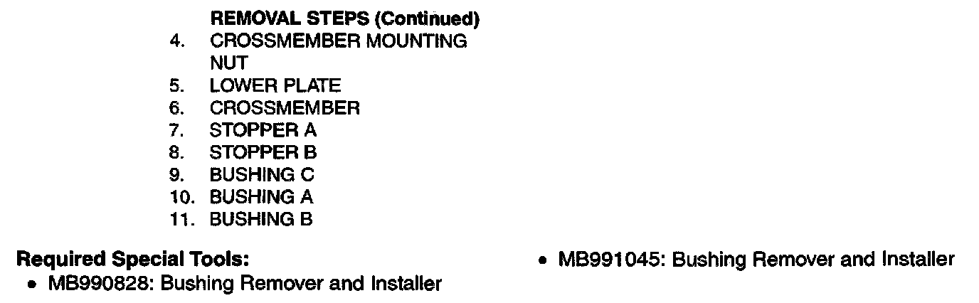 1. Use special tool MB990828 to drive out and press-fit the crossmember bushing C.