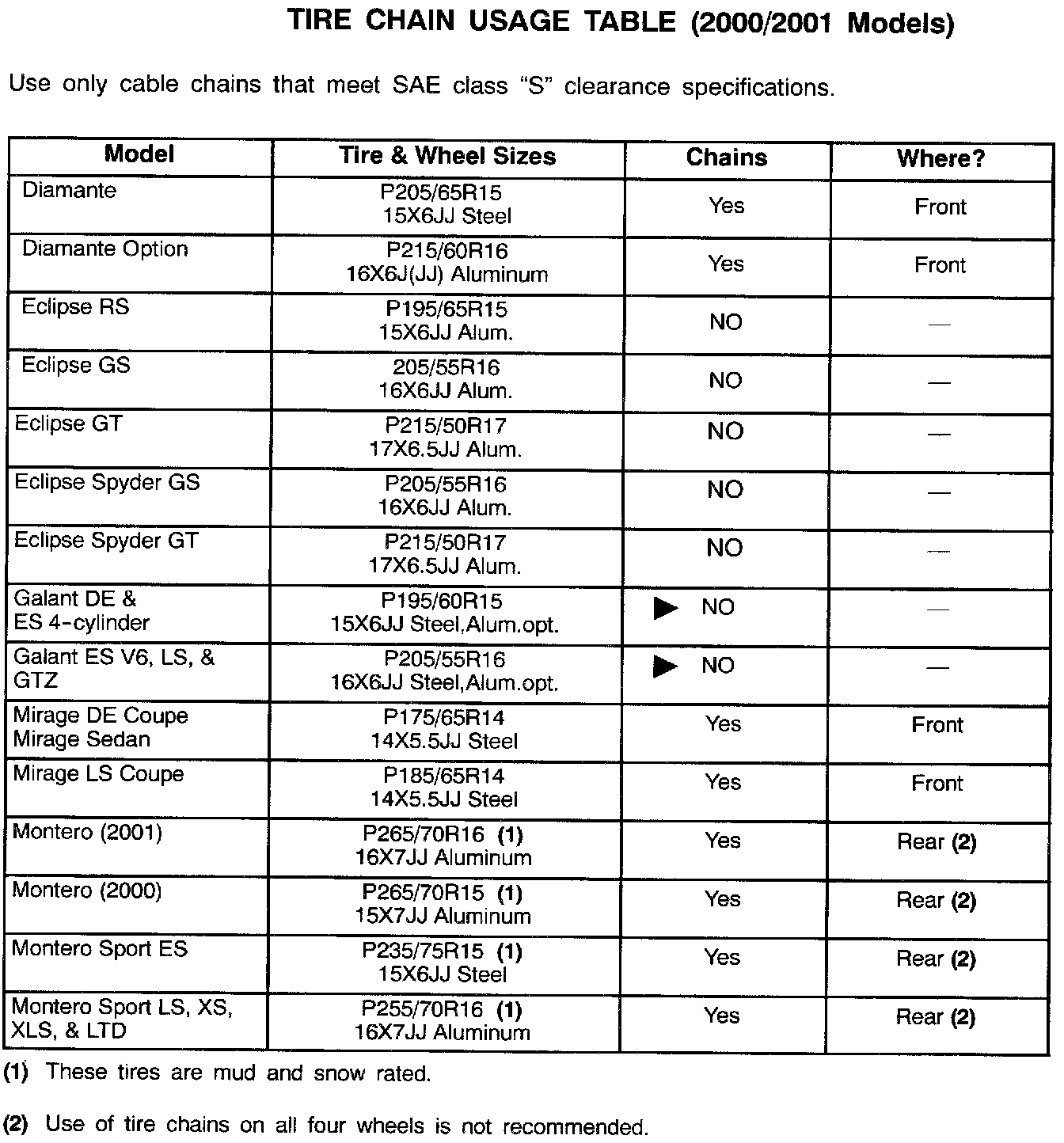 This bulletin contains tire chain usage recommendations for 2000 and 2001 Mitsubishi cars and sport-utility vehicles.