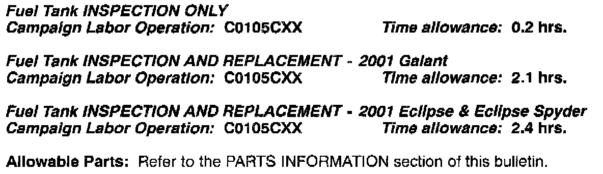The fuel tanks on certain 2001 Galant, Eclipse, and Eclipse Spyder vehicles have a safety defect which could lead to fuel leakage. A bulge created during the tank manufacturing process may have resulted in a thinning of the tank material during a welding operation.
