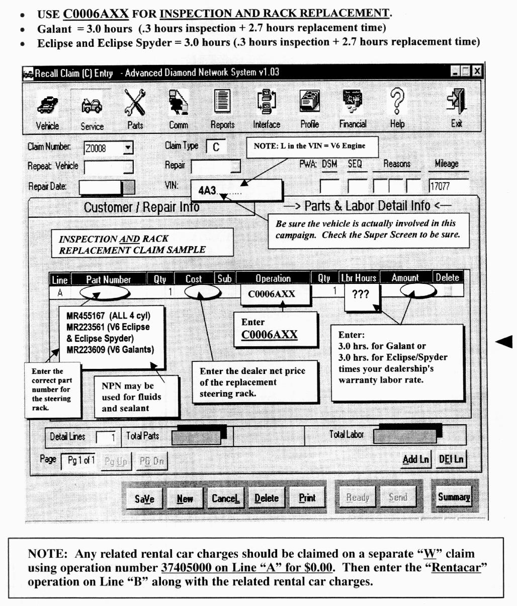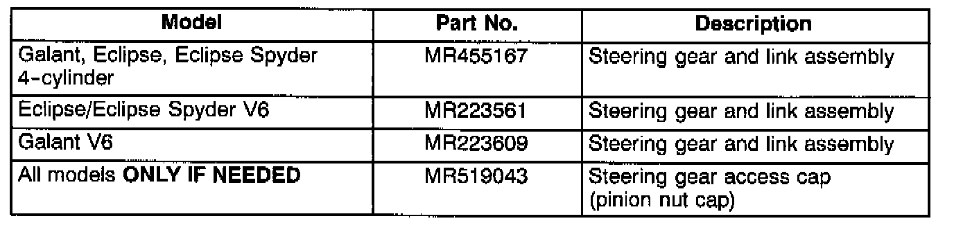 This bulletin supersedes SR-00-004, issued in August, 2000, to increase Galant steering gear assembly replacement labor time. Revised information is marked.