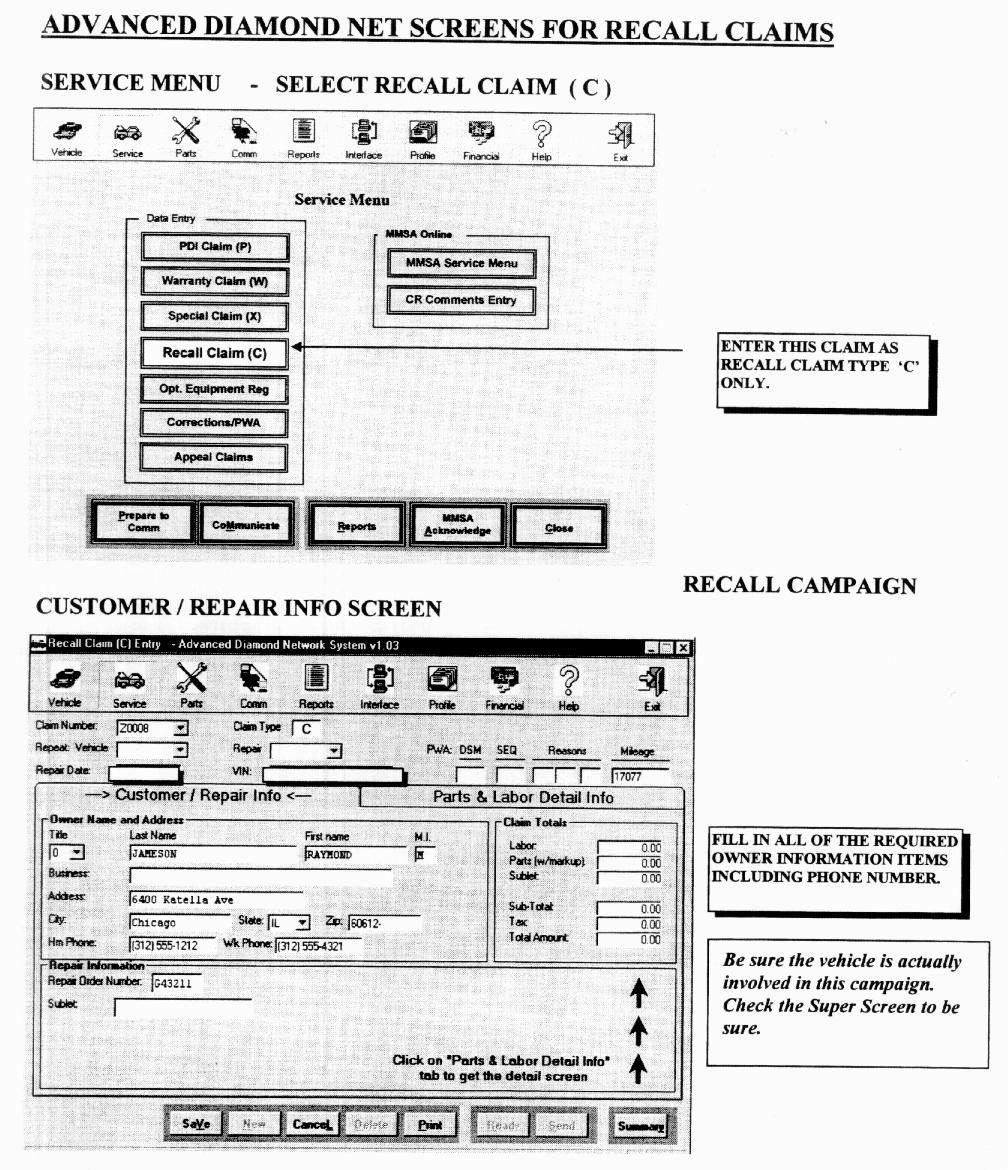 Claims for this campaign must be entered as "C" type claims (E-5) on your Diamond Network Warranty Menu). Sample claim screens are shown.