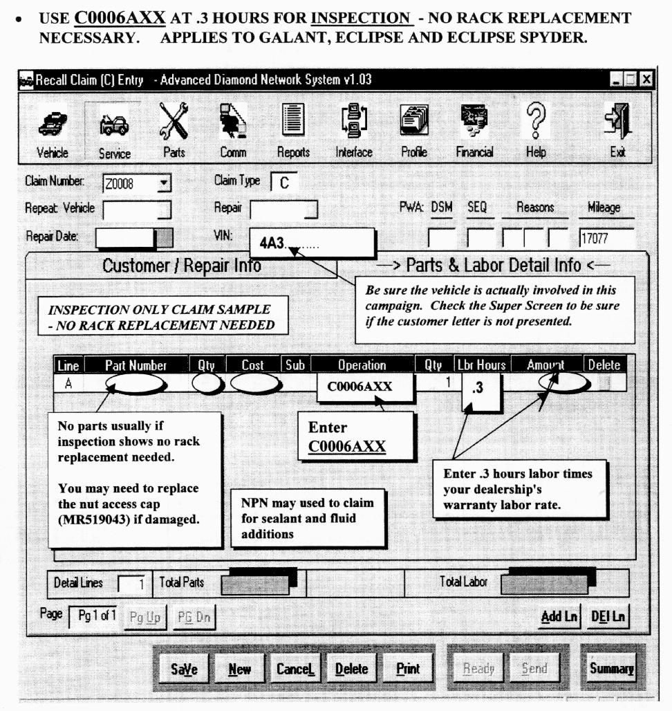 RECALL CAMPAIGN CLAIM PARTS AND LABOR DETAIL INFO SCREEN: