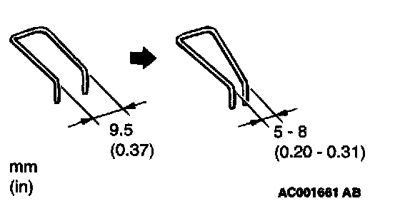 1. Make sure that there is no excessive play at the shift cable end clip. If there is an excessive play or the clip is disengaged from the shift cable end, check the clip opening gap. If the gap is more than 9.5 mm (0.37 inch), deform the clip until the gap reaches 5 to 8 mm (0.20 to 0.31 inch).
