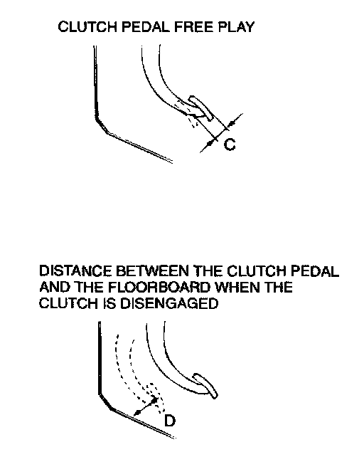 6. After the adjustments, confirm that the clutch pedal free play (measured at the face of the pedal pad) and the distance between the clutch pedal (the face of the pedal pad) and the floorboard when the clutch is disengaged are within the standard value ranges.
