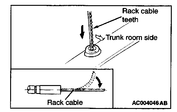 4. Insert the rack cable into the motor assembly with the rack cable teeth facing the luggage compartment room side.