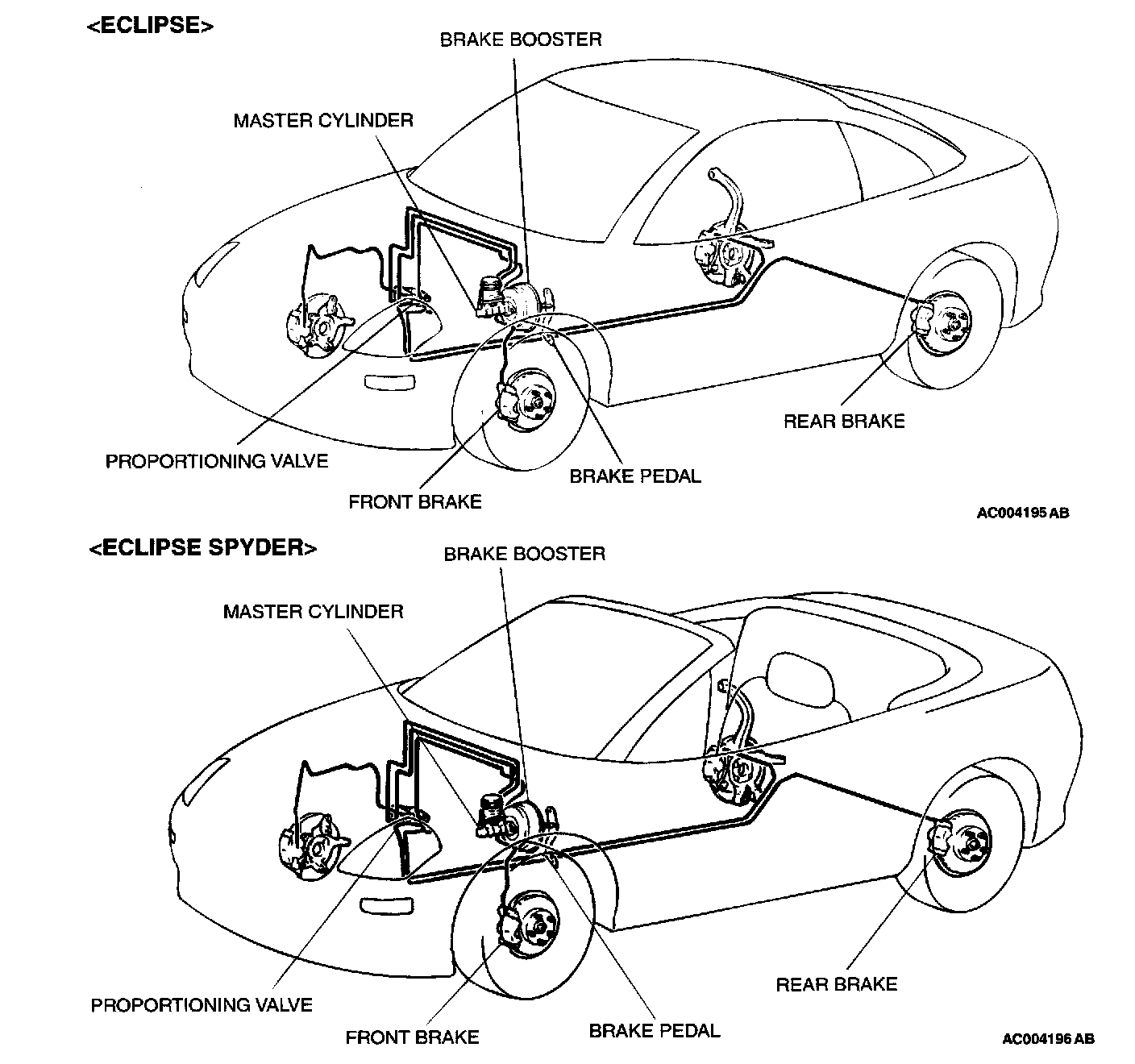 GENERAL DESCRIPTIONThe basic brake system uses a X-type hydraulic feed arrangement. The left front and right rear brakes operate together from the same circuit, right front and left rear operate likewise. If a leak develops in the left front line or piston, the right rear brake would be affected. For safety and control, the right front and left rear circuit operates normally, providing stable braking. In this case, the left front leak must be repaired immediately as the right front left rear circuit is only provided half the braking power required for this vehicle. The main features are as follows: