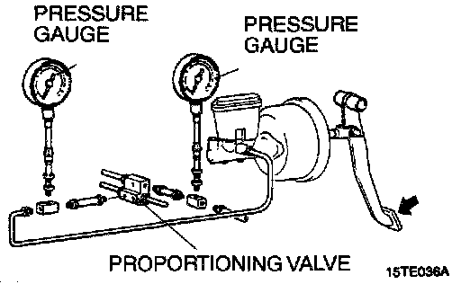 PROPORTIONING VALVE FUNCTION TEST1. Connect two pressure gauges, one each to the input side and output side of the proportioning valve, as shown.