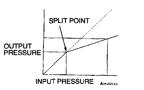 1) Output fluid pressure begins to drop relative to input fluid pressure (split point).