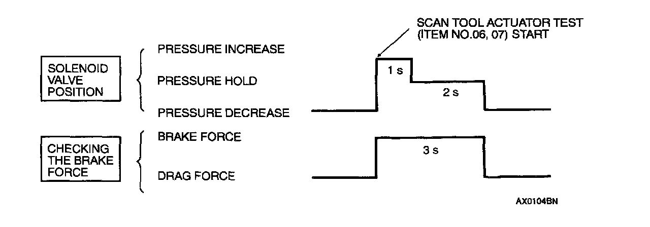 6. Turn the wheel by hand and check the change in braking force. Use a braking force tester. The braking force reading value should change when the actuator test is carried out. The result should be as shown in the diagram above.